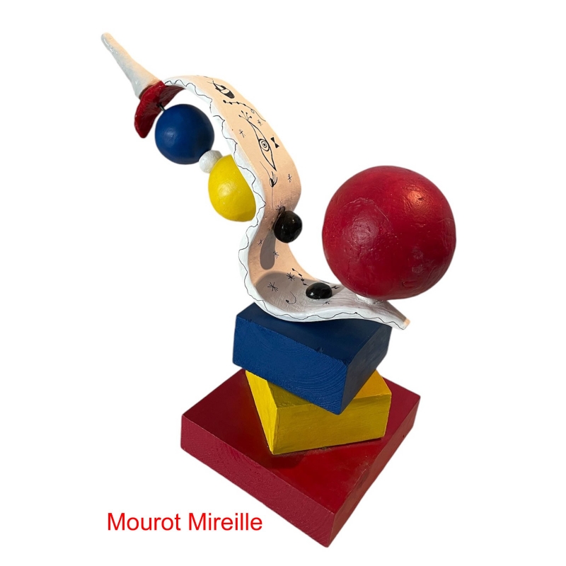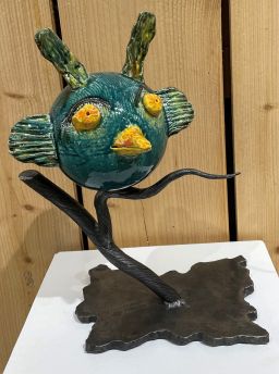 Des sculptures de bestioles imaginaires,très colorées qui sont nées d'une tristesse profonde et du besoin d'en sortir en inventant des bêtes étranges, parfois attachantes, bizarres, ou inquiétantes en réaction à l' absurdité du monde actuel. Moi je fais la bestiole en faÏence et nous avons conçu le socle avec mon ami ferronnier d'Art William Leclercq